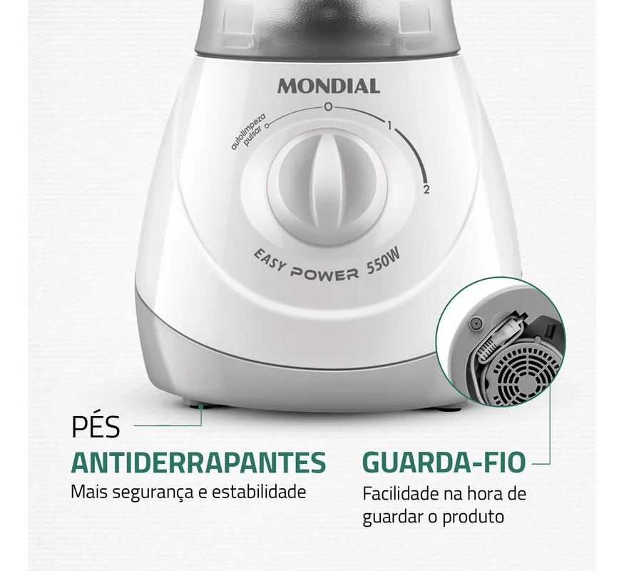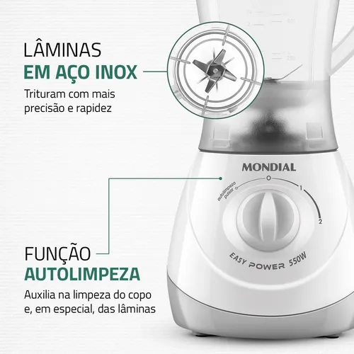 “O liquidificador Mondial Easy Power 550W é um aliado na rotina na cozinha. São 550W de potência, capacidade total de 1,9 litros, além de 2 velocidades + Função Pulsar, que tritura até ingredientes mais duros. Você pode preparar torta de frango, bolo de milho, pão de queijo, massa de panqueca, queijadinha e muitas outras receitas com praticidade e rapidez. Saiba mais sobre o L-550-W: